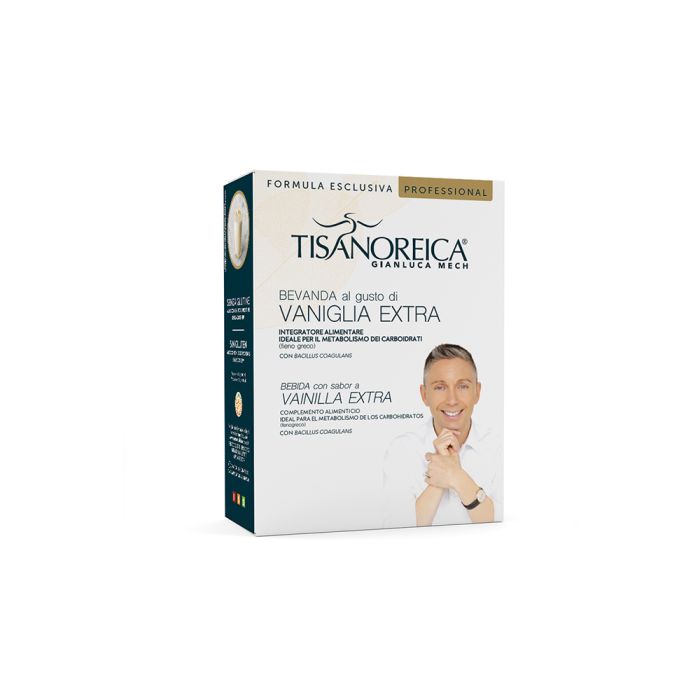 Preparación: [mezcla de proteínas: (caseína micelar (derivada de LECHE), proteína de suero: (proteína de suero aislada, proteína de suero hidrolizada), colágeno bovino hidrolizado), espesante: goma xantana, aromas, sal, emulgentes: (lecitina de girasol, lecitina de SOJA)], aromas, Activador Profesional Tisanoreica® 4% [goma de acacia (Acacia seyal Delile), papaya (Carica papaya L.) fruto e.s., comino (Cuminum cyminum L.) fruto e.s., APIO (Apium graveolens L.) fruto e.s., cola de caballo (Equisetum arvense L.) parte aérea e.s., fenogreco (Trigonella foenum-grecum L.) semilla e.s., eneldo (Anethum graveolens L.) fruto e.s., mate (Ilex paraguariensis A. Hojas de C. s. n. e., canela (Cinnamomum zeylanicum Blume, Cinnamomum cassia (Nees & T.Nees) J.Presl) corteza (E. s.), malva (Malva sylvestris L.) hojas (E. s.), polidextrosa, sal, aroma, Bacillus coagulans 25 mil millones de UFC/g, edulcorante: sucralosa, lactasa, antiaglomerante: dióxido de silicio.